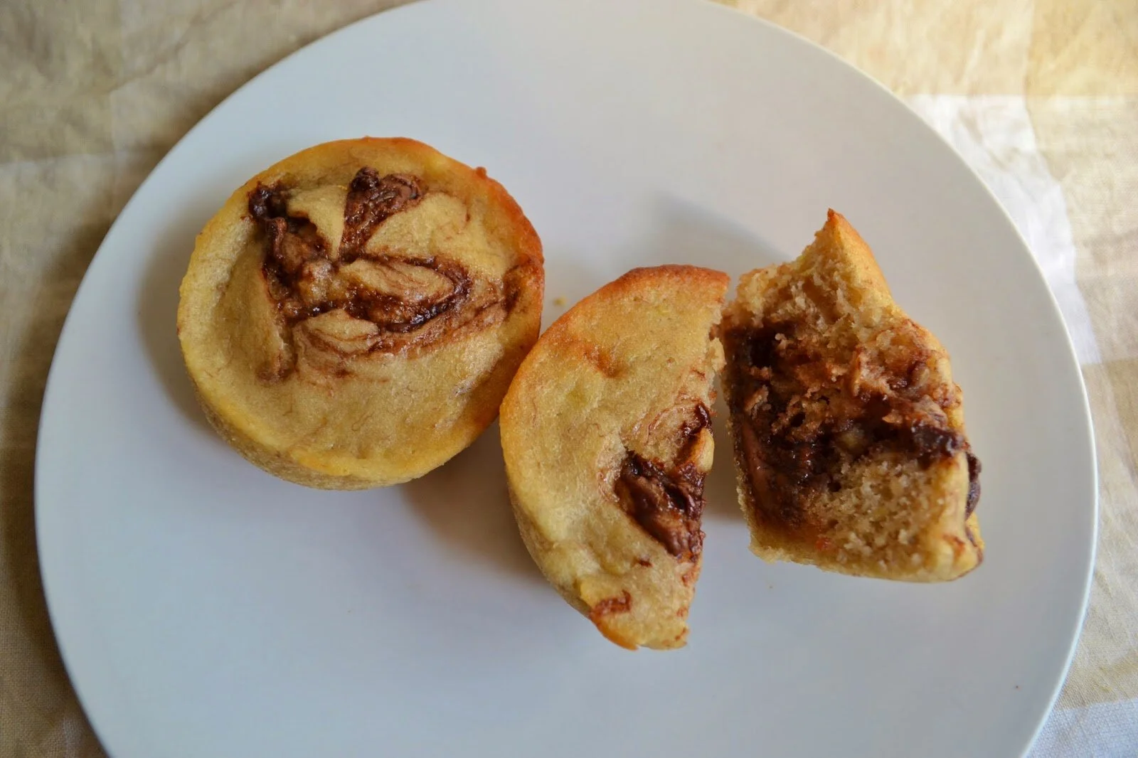 Distribute the batter in to the muffin cup. Using a spoon, place a dollop of Nutella over each muffin and use a knife to swirl it in. You can use as much Nutella as you would like, but try not to add too much (otherwise the Nutella sinks to the bottom of the muffin and sticks to the pan). Bake the muffins for 12 minutes, or until a knife inserted in the center comes out clean. Allow to cool a bit before removing them from the muffin tin.