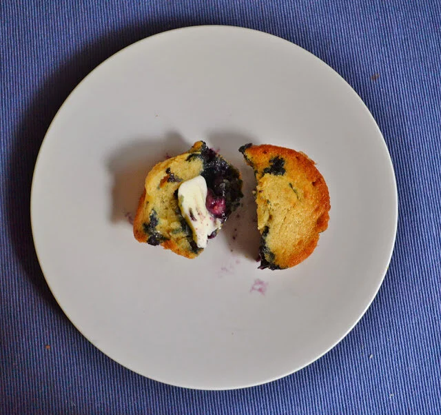 Cream the butter and sugar together until light and fluffy. Add the eggs one a a time and beat well. Add milk and vanilla and beat well. Finally, stir in the flour mixture, being careful not to over mix. Stir in the blueberries. Fill the muffin cups 2/3 full and bake the muffins for 25 to 30 minutes, or until a toothpick inserted in to the center comes out clean. I like to eat these warm with butter, but they're great plain as well.