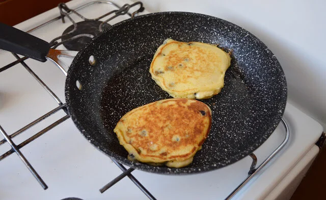 Melt a little butter in a large skillet over medium heat. Drop the pancake batter by 1/4 cupfuls into the skillet. Cook the pancakes until the bottoms are golden brown and bubbles form on top, about 2 minutes. Using a spatula, turn the pancakes over. Cook until the bottoms are golden brown, about 2 minutes.