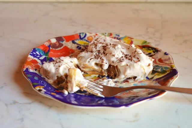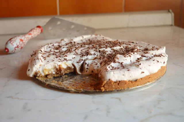 Once the crust is completely cold, cover it with a nice layer of dulce de leche (I use almost the whole jar for this). Cover the dulce de leche with a layer of bananas. Next, using electric beaters, mix the whipping cream and powdered sugar together until the cream is whipped to soft peaks. Spread a layer of the cream over the bananas and dulce de leche. Sprinkle with chocolate shavings.