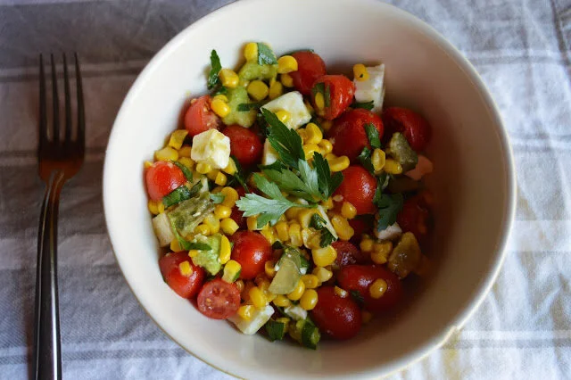 A couple of notes: If you can grill the corn for the salad, go for it! I don't have a grill here so I have sauteed the corn and also boiled it -- which is still great! -- but grilling the corn would give it a nice smokey flavor. I squeezed a little extra lime juice over the avocado before adding it to the salad to keep the bright green color longer. I meant to add a little chopped red onion to this salad and totally forgot before photographing, so give that a try if you have a better memory than me. This would make a great accompaniment to steak, chicken, or fish.
