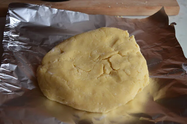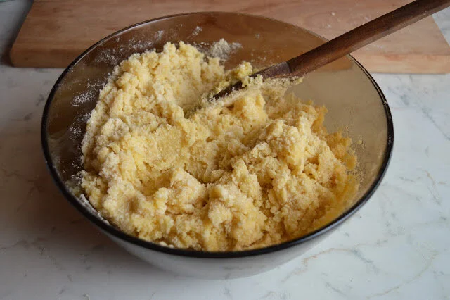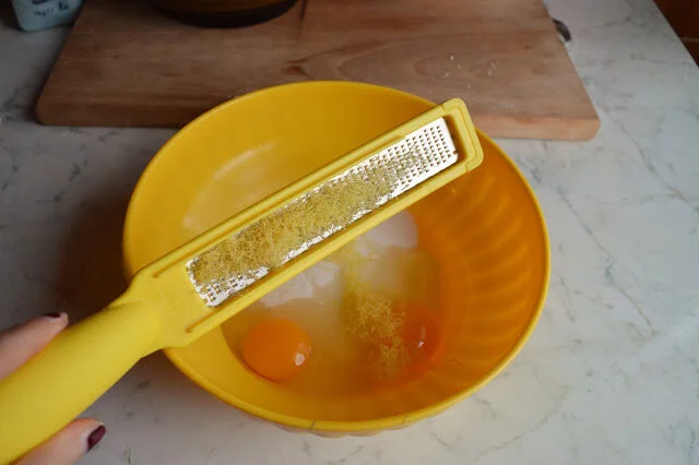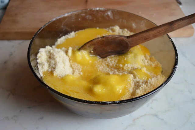 Set aside the flour-butter mixture. In a separate smaller bowl, whisk together the lemon zest, sugar, and eggs. Pour wet ingredients into the flour-butter mixture and use a wooden spoon to stir until a dough begins to come together. Turn the dough out onto a floured surface, knead it a few times to make a ball of dough, then wrap the dough in plastic wrap or aluminum foil and place it in the fridge.