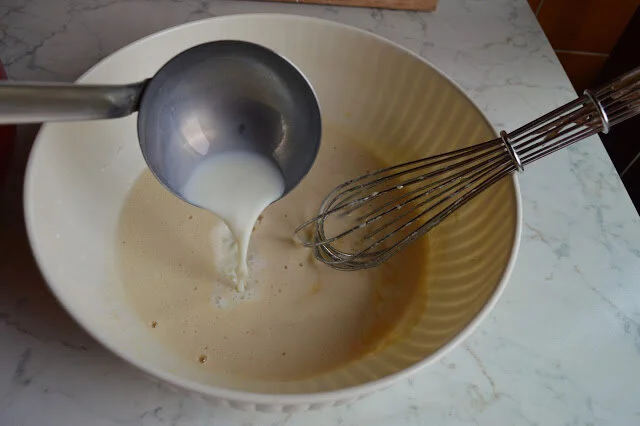 Slowly whisk the hot milk mixture into the egg mixture a little at a time to temper it, i.e don’t add all the milk at once otherwise you will end up with scrambled eggs. I usually take the pot off the stove and use a ladle to ladle the mixture in a little at a time, but if you have a sous chef or someone to help they can pour the milk into the egg mixture slowly for you as you do the whisking.