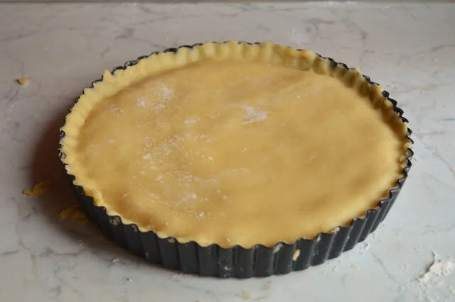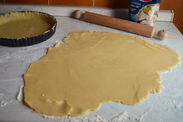 Last steps – preheat the oven to 350 degrees Fahrenheit and grab the dough that you put in the fridge. Divide it into two pieces, with one slightly larger than the other. Roll out the smaller piece of dough into a large circle and place it carefully into the bottom of a 9-inch diameter tart pan with a removable bottom. Cut off any extra dough so that it fits the pan, and then prick the dough with a fork.