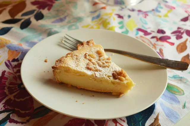 Torta della Nonna is a classic Italian dessert which requires not one, but two magical, glorious, homemade pastry crusts (hurray!!!) In terms of fame it is just behind the better known but no more delicious tiramisù and panna cotta, and its name, translated from Italian to English, would be "Grandmother's Cake." My own Italian grandmother has never made us this dessert -- she's more of a pan di spagna kind of gal -- but I wouldn't mind in the least if she did. Here we have a smooth custard filling bursting with bright lemon and sweet vanilla, sandwiched between buttery, citrus-y crusts, bejeweled with toasty pine nuts and finished off with a veil of snowy powdered sugar. It doesn't look like much -- no mile high layers, no frosting, no chunks of chocolate -- but it is a lovely, home-y dessert that exemplifies the expression "less is more," as most Italian desserts do, good with your afternoon tea or as an understated end to a meal. While it's true this has a few more steps than your average every day cake, you'll find that none of them are difficult, and I think you'll feel distinctly savvy as you whisk together your own custard and roll out your homemade crust, not so unlike an authentic, expert Italian grandmother.