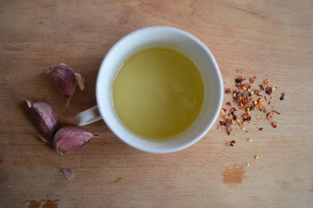 Bring a large pot of water to a boil and then add the cicoria. Boil the cicoria for 10 minutes; drain. In the meantime, when the cicoria is reaching the end of its boiling time, heat a good amount of olive oil -- enough to coat the bottom of the pan, and then some -- in a large pan over medium heat. Add red pepper flakes or sliced chili to taste, as well as a clove or two of garlic.