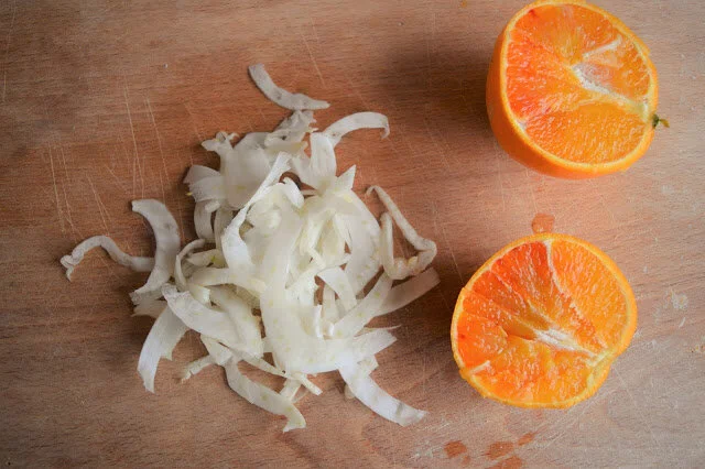 Next, using a knife to cut away the skin and pith of each orange. Cut horizontally to make round orange slices, or cut vertically and separate the orange wedges away if you'd prefer wedges. Add to the bowl with the fennel. Halve and large olives and add them to the bowl. Thinly slice the red onion and add it to the mix.