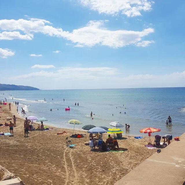 After a weekend near the sea in Naples and a long week in a new job at FAO that I am not having the easiest time adjusting to, I felt like a weekend by the beach was in order, so we booked a bed and breakfast in Sperlonga, a little town about an hour and a half outside Rome by train, right by the sea. Since food is always a priority -- the restaurant on the beach had not only spaghetti alle vongole and other seafood but also prosciutto e melone and caprese, two of my heat-less Summer standbys, plus a specialty of the region, tiella, which is a savory pie with either a scarola (escarole) or polpo (octopus) filling. Delish.