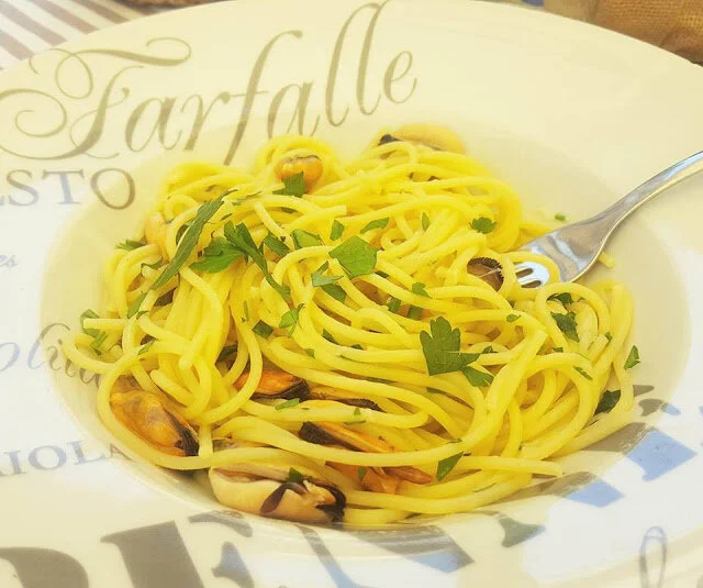Before getting our afternoon train, we finished our short stay in Naples off with lunch, spaghetti con cozze e pecorino, or rather, spaghetti with mussels and Pecorino cheese. While seafood and cheese don't usually mix in Italian cooking, they do make some exceptions, sometimes, with cozze e pecorino being one of them. It was delicious and the perfect send-off to a weekend in Naples -- special thanks to our friend Mari for the excellent restaurant suggestion!