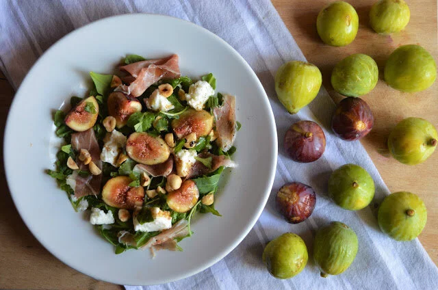 A couple of notes: This salad is infinitely flexible; replace the hazelnuts with pistachios or pine nuts, the mozzarella di bufala with goat cheese or even feta cheese, or leave out the prosciutto for the vegetarians, if you want. You can use either purple or green figs here -- both work.
