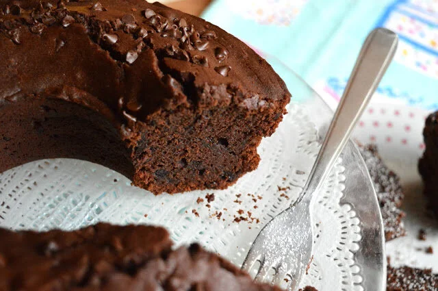 Add the vanilla and eggs to chocolate mixture and whisk until well combined. In a large bowl mix together flour, cocoa, baking powder, and salt. Add one cup of the flour mixture to the chocolate and stir until a smooth paste forms. Repeat with another cup of the chocolate mixture. Add remaining chocolate mixture and stir until mixture is smooth. Stir in the chocolate chips. Pour the batter into the prepared pan. Bake the cake for 45 to 60 minutes, until a toothpick inserted into the center of the cake comes out clean without any batter. If the cake is browning too much while baking, cover it loosely with aluminum foil. Allow cake to cool on a wire rack to room temperature before turning it out of the pan. Serves 10-14, depending on how big the slices are.
