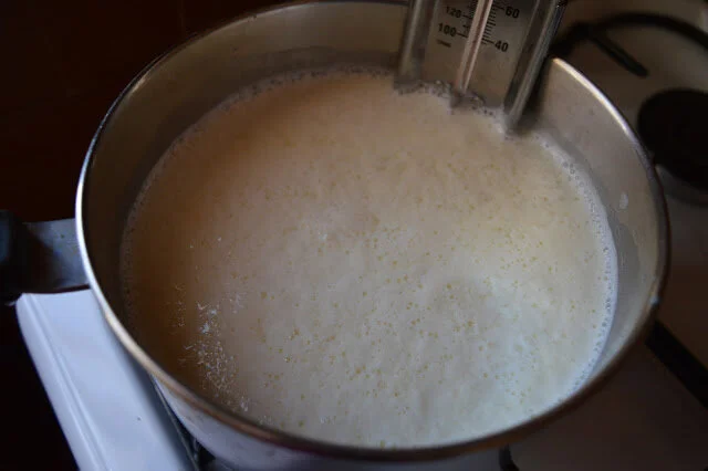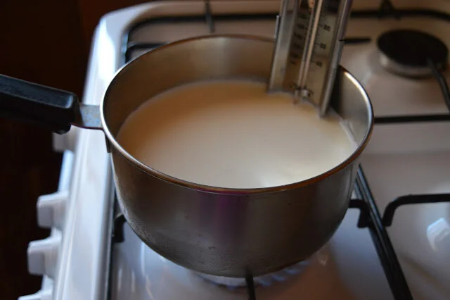 Pour the milk, cream and salt into a 3-quart nonreactive saucepan. Attach a candy or deep-fry thermometer. Heat the milk to 190°F (that would be about 88 degrees Celsius) stirring it occasionally to keep it from scorching on the bottom.