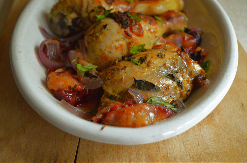 A couple of notes: You can also take this in a much more Fall direction and roast this chicken with apples instead of plums, substituting sage for the basil. I think I will also give this a try with fennel instead of the red onion. The recipe as written calls for 4 cloves of garlic; not much of a fan of garlic, I reduced this to two. Do as you see fit. Stay tuned!