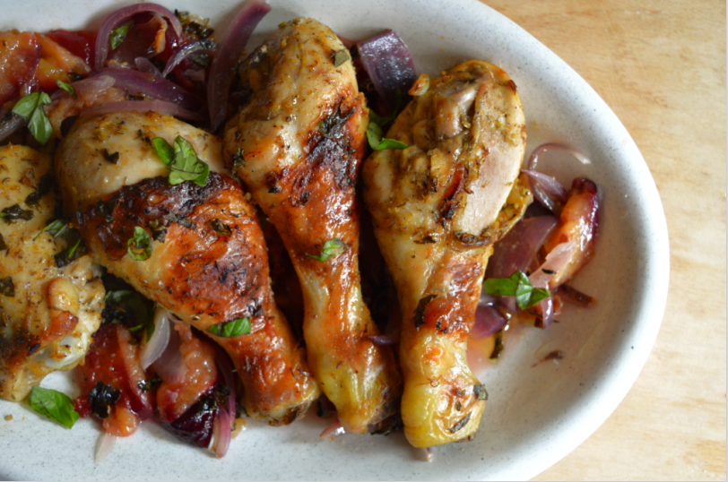 Roast until chicken is golden and cooked through, 30 to 45 minutes, removing the white meat if it’s done before the dark meat. Transfer chicken pieces as they are done to a platter. Spoon the plums and onions around the chicken. Drizzle a little of the pan drippings over the chicken and serve, garnished with the herbs and flaky salt.